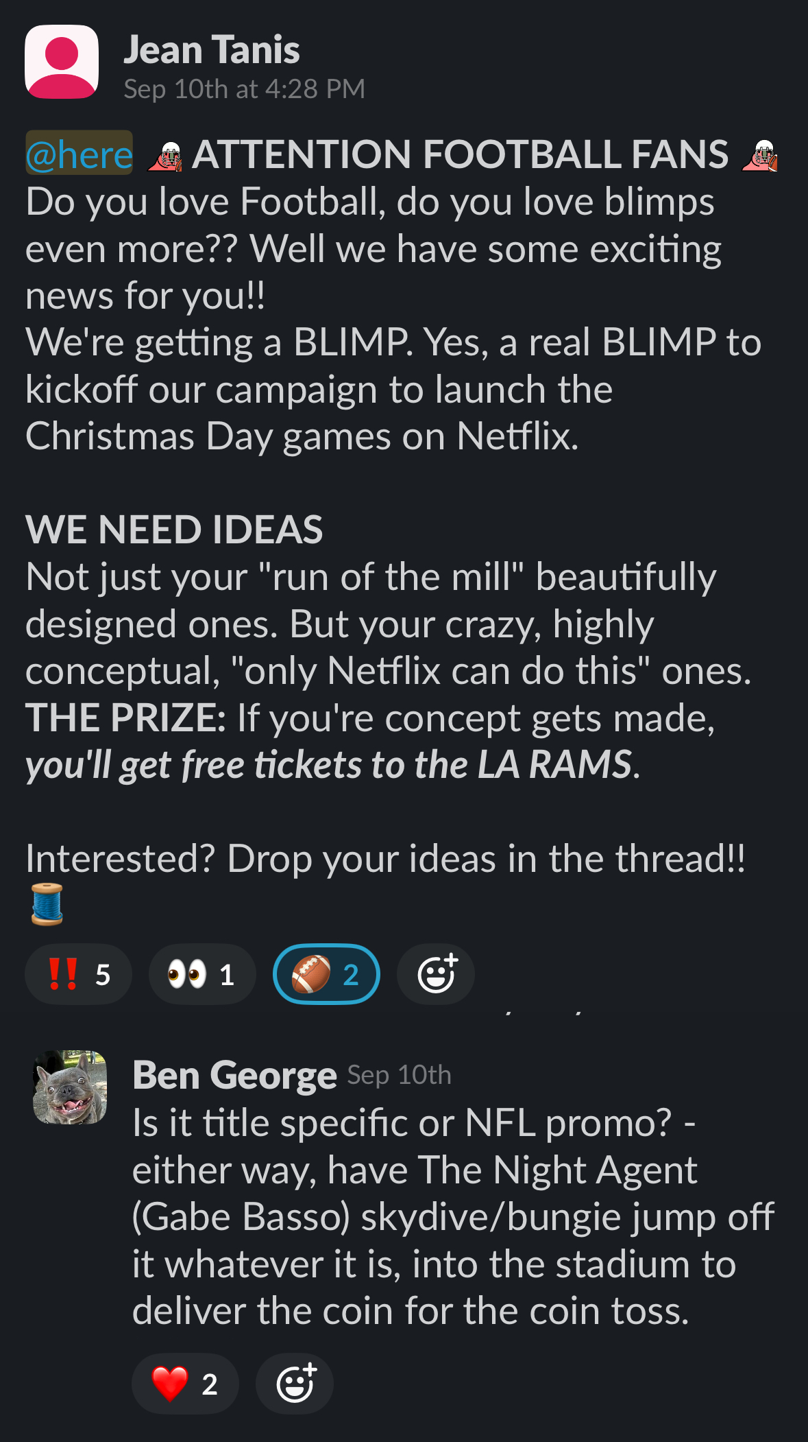 The Netflix Live marketing team slacked everyone in the organization. My idea to yeet Gabe out of the blimp ultimately won. Jean still owes me Rams tickets.